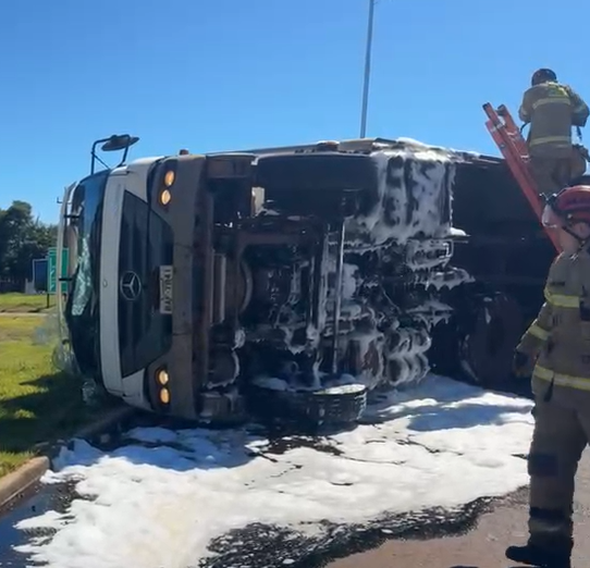 Um caminhão frigorífico ocupado pelo condutor e um passageiro tombou após o motorista perder o controle da direção ao tentar acessar o Jardim Santa Cruz. O acidente mobilizou equipes de resgate e causou vazamento de óleo na via.