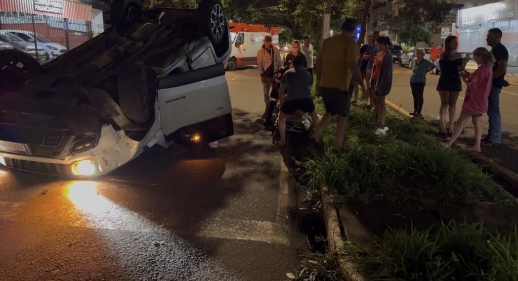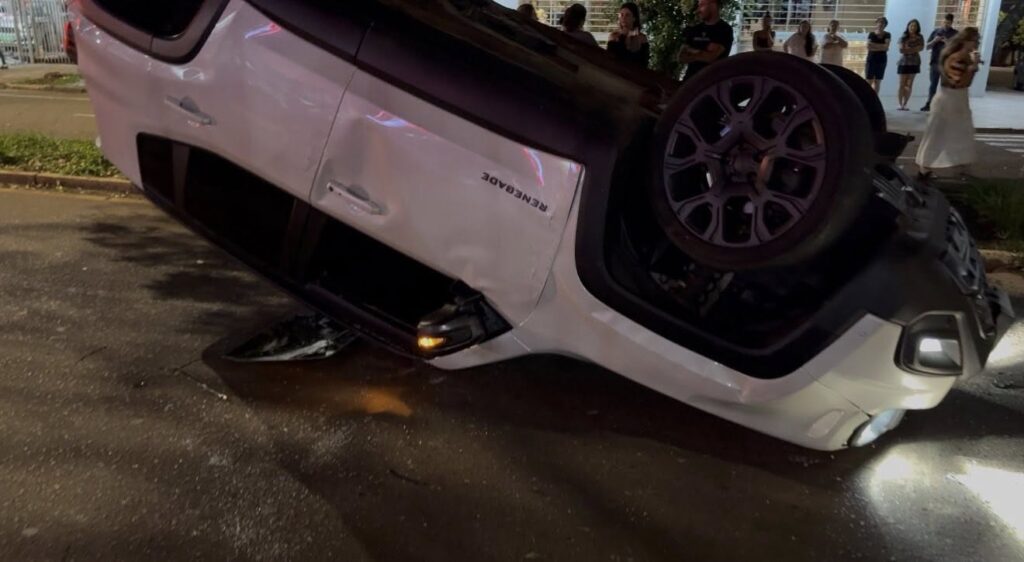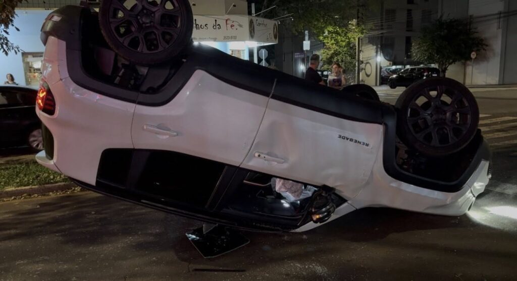 Um acidente envolvendo um Jeep Renegade foi registrado na noite deste domingo (12), na Avenida Goioerê, em Campo Mourão. O veículo colidiu contra uma árvore e tombou na via, mobilizando equipes de socorro e segurança.