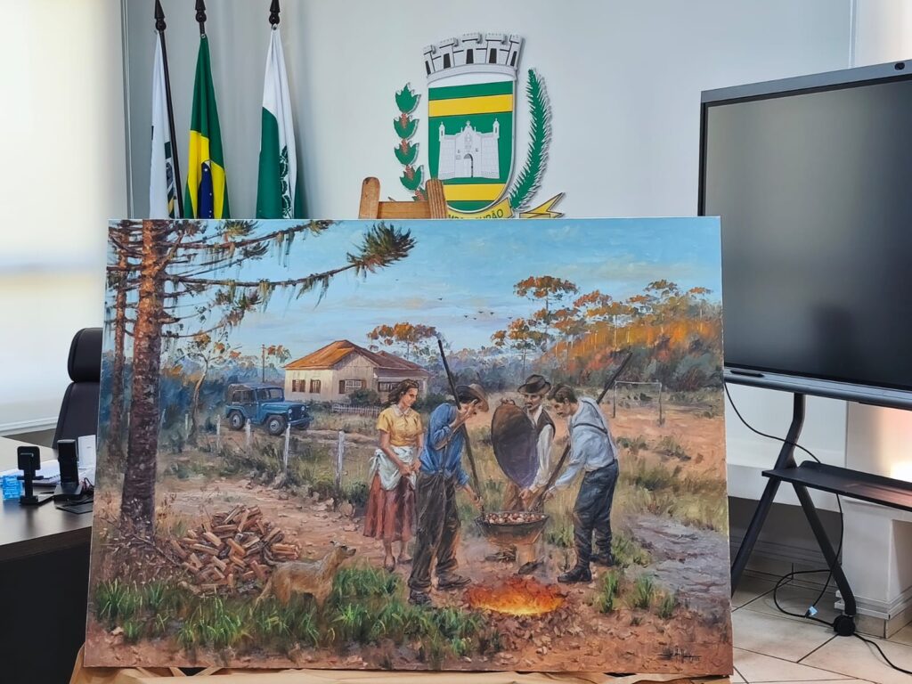 A obra “O Surgimento do Carneiro no Buraco”, pintada pelo artista Saulo Pfeiffer, foi entregue oficialmente nesta quinta-feira (18) à prefeitura de Campo Mourão em cerimônia no gabinete do prefeito Douglas Fabrício. O quadro em óleo sobre tela mostra a retirada do tacho do prato típico de Campo Mourão por pioneiros, numa paisagem da cidade quando a iguaria começou a ser preparada no início da década de 1960.