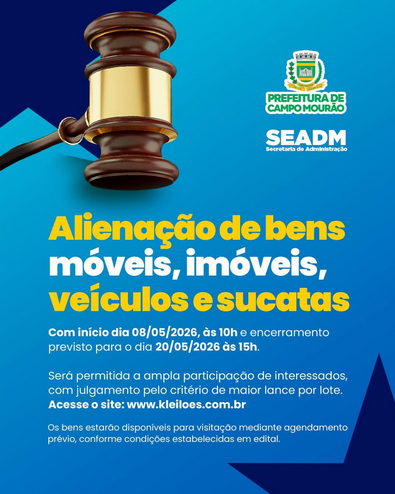 A Prefeitura de Campo Mourão promove, entre os dias 8 e 20 de maio de 2026, um leilão público eletrônico para a alienação de bens considerados inservíveis à Administração Municipal. O certame será realizado de forma totalmente online, com julgamento pelo critério de maior lance por lote.