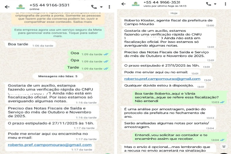 De acordo com a prefeitura, golpistas têm feito contato por WhatsApp, e-mail e outros meios eletrônicos solicitando informações fiscais sigilosas, como notas fiscais, balancetes e demais documentos contábeis. Para conferir aparência de legitimidade, os criminosos utilizam nomes de servidores ou ex-servidores e chegam a inserir o brasão oficial do Município em fotos de perfil. Um dos casos identificados envolve o número (44) 99166-3531, que estava associado ao nome de ex-servidor e a um e-mail falso: roberto.pref.campomourao@gmail.com.