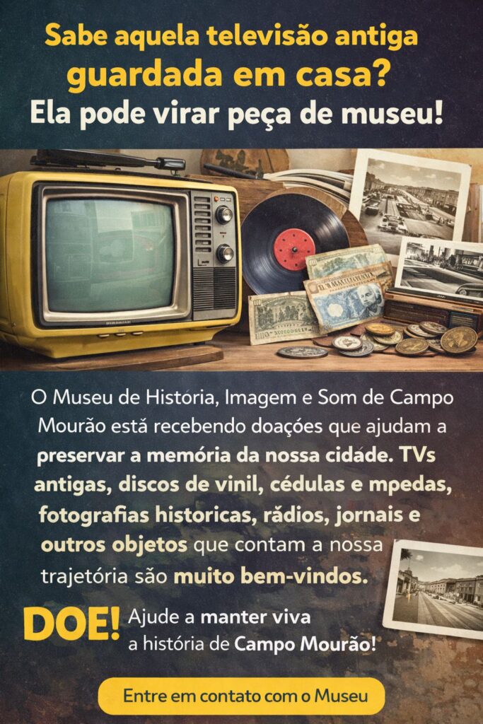 O Museu de História, Imagem e Som de Campo Mourão está recebendo doações que ajudam a preservar a memória da nossa cidade. TVs antigas, discos de vinil, cédulas e moedas, fotografias históricas, rádios, jornais e outros objetos que contam a nossa trajetória são muito bem-vindos.