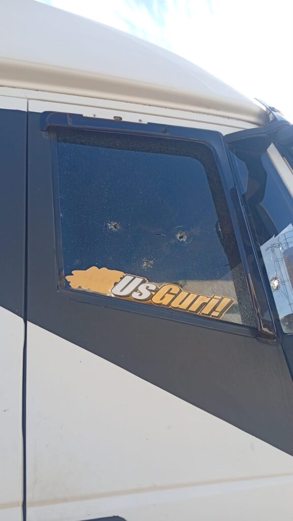 Criminosos em um GM/Vectra atiraram contra o para-brisa para forçar a parada, mas o caminhoneiro colidiu no veículo dos bandidos, fazendo-o capotar para fora da pista.