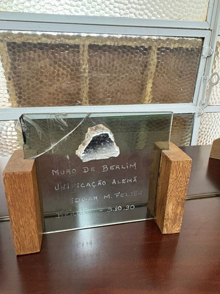 Entre os objetos mais inusitados do acervo está um pedaço do Muro de Berlim, que conecta Campo Mourão a um dos acontecimentos mais emblemáticos da história mundial do século XX, ampliando o alcance histórico do Museu para além das fronteiras nacionais. A doação foi feita pela empresária Ester Piacentini, em 2023.